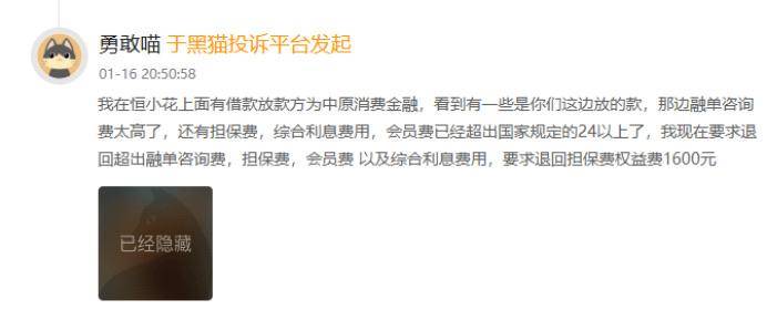 有用户投诉称,其在恒小花平台借款,放款方为中原消金,期间被收取融单咨询费、担保费、会员费及综合利息等多项费用,为此用户提出退回1600元担保费、权益费的诉求。