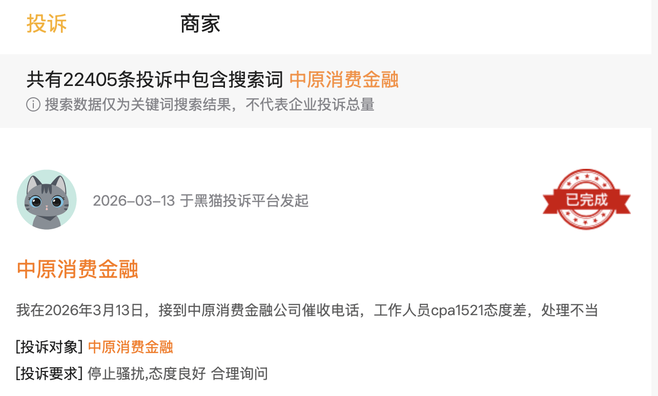 中原消金在业务快速扩张的同时,也面临着用户投诉的集中爆发。截至目前,黑猫投诉平台上针对中原消金的相关投诉已超2万条,核心争议焦点集中在综合融资成本偏高、息费结构不透明两大问题上。多位借款人反馈,除正常利息外,还被违规收取融单咨询费、担保费、会员费等多项附加费用,综合资金成本显著偏高,甚至部分场景下实际年化利率逼近监管红线。