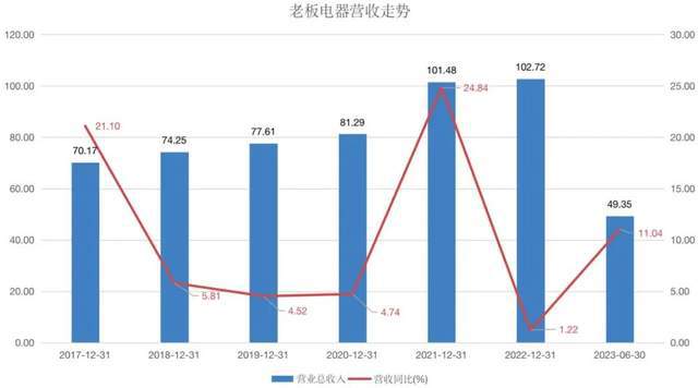 2017年-2022年全年以及2023年上半年,老板电器的营收分别为70.17亿元、74.25亿元、77,61亿元、81.29亿元、101.48亿元、102.72亿元、49.35亿元。