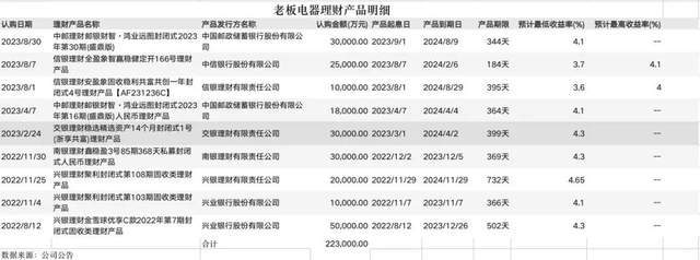 据统计,截至9月26日,老板电器未到期理财产品总金额22.3亿元,未到期理财产品个数有9只。