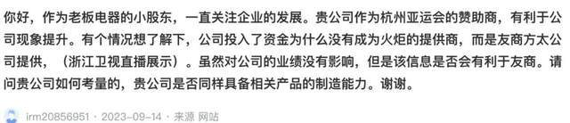 对此,有投资者在深交所互动易平台上提问到:“贵公司作为杭州亚运会的赞助商,有利于公司现象提升。想了解下公司投入了资金为什么没有成为火炬的提供商,而是友商方太公司提供。虽然对公司的业绩没有影响,但这样是否会有利于友商?”