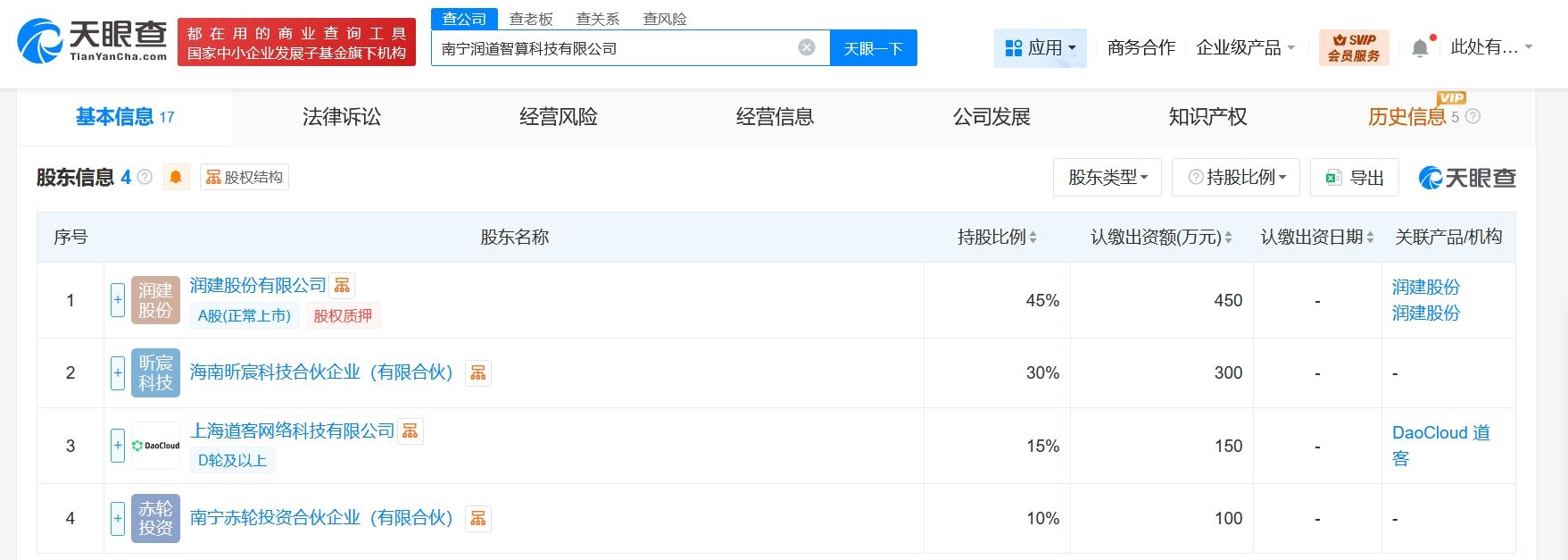 天眼查工商信息显示,近日,南宁润道智算科技有限公司成立,法定代表人为赖凯,注册资本1000万人民币,经营范围含软件开发、人工智能应用软件开发、互联网数据服务、人工智能基础软件开发、信息系统集成服务、人工智能通用应用系统、人工智能公共数据平台、云计算装备技术服务等。股东信息显示,该公司由润建股份有限公司、海南昕宸科技合伙企业(有限合伙)、上海道客网络科技有限公司、南宁赤轮投资合伙企业(有限合伙)共同持股。