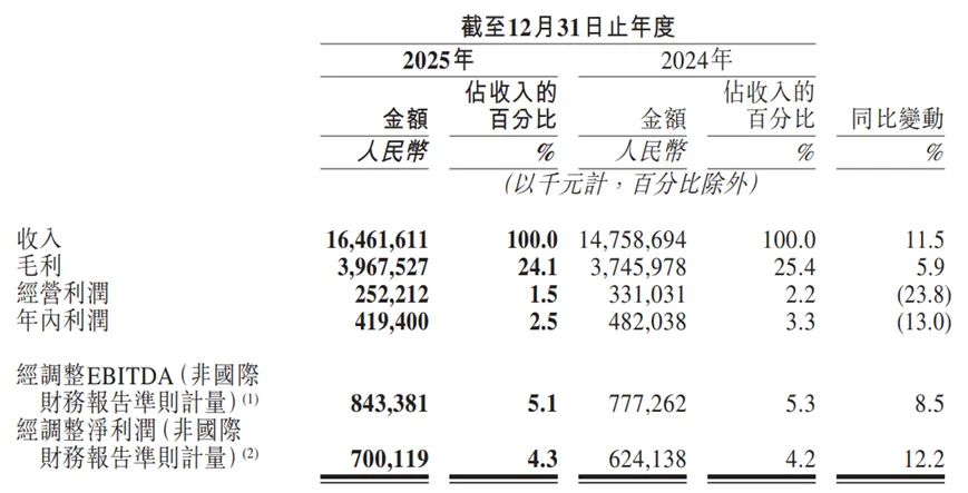 不过,公司在利润端的表现略显疲态。按照国际财务报告准则,2025年净利润仅为4.19亿元,较上年同期的4.82亿元下降13%;净利率从3.3%下滑至2.5%,盈利能力明显承压。即便采用非国际准则计量的经调整净利润达到7.0亿元,同比增长12.2%,也难以掩盖下半年业绩断崖式下跌的事实——2025年下半年经营利润仅为3028万元,同比暴跌74.6%;期内利润1.13亿元,同比下降42.9%。