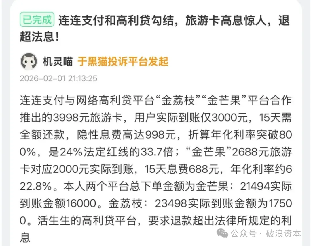 近日,黑猫投诉平台上一场集中投诉潮引发行业关注,数十名消费者集中控诉多款网贷产品以“旅游卡”权益为掩护,暗中收取高额砍头息、发放超利贷,部分产品综合年化利率最高突破800%,远超国家法定民间借贷利率司法保护上限,形成一条涉及助贷平台、旅行社、持牌小贷、支付机构的灰色产业链,严重侵害消费者合法权益。