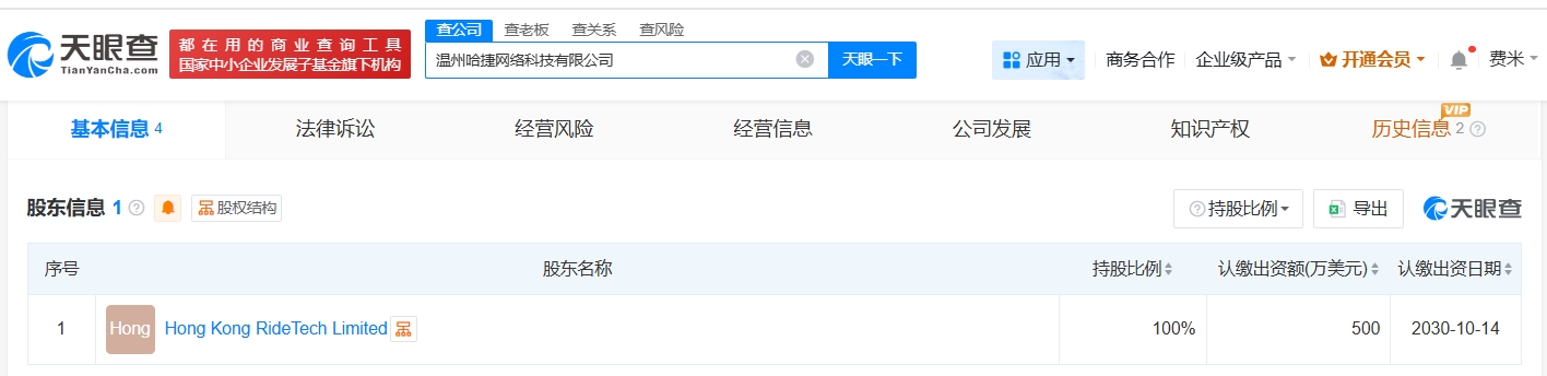 天眼查App显示,近日,温州哈捷网络科技有限公司成立,法定代表人为邢成,注册资本500万美元,经营范围包括网络技术服务、机械设备租赁、共享自行车服务等。股东信息显示,该公司由哈啰出行旗下Hong Kong RideTech Limited全资持股。