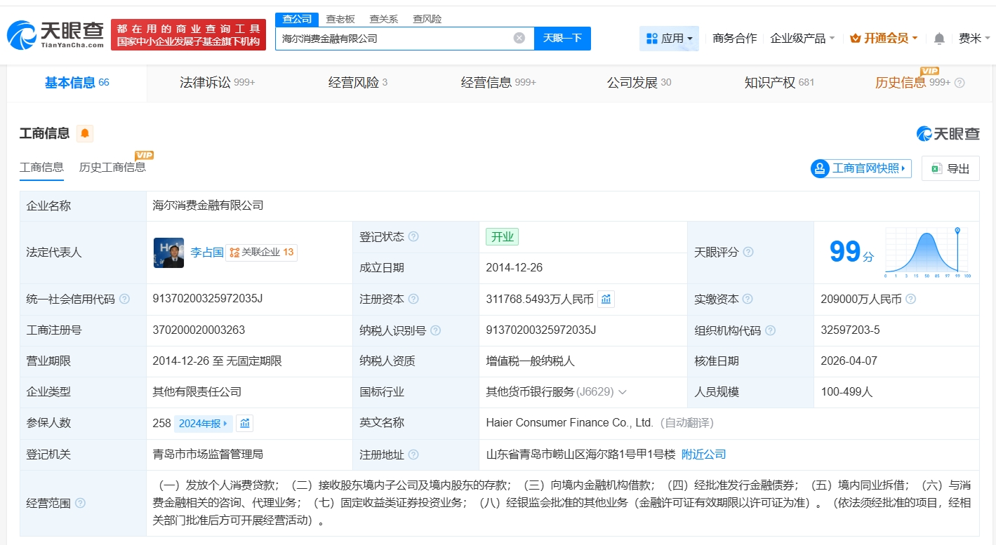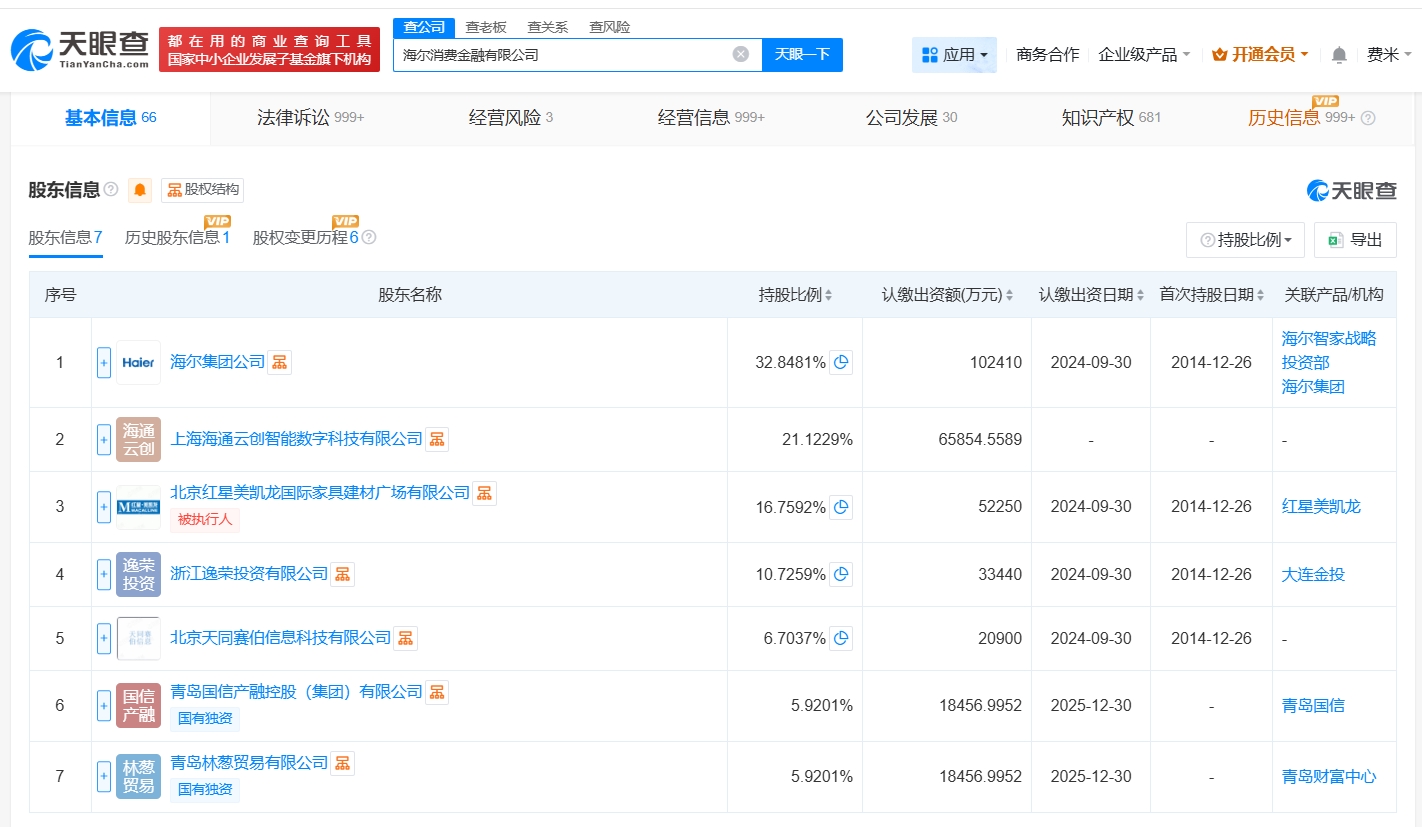 该公司成立于2014年12月,法定代表人为李占国,经营范围包括发放个人消费贷款、接收股东境内子公司及境内股东的存款、向境内金融机构借款等。股东信息显示,该公司由海尔集团公司、上海海通云创智能数字科技有限公司、北京红星美凯龙国际家具建材广场有限公司等共同持股。
