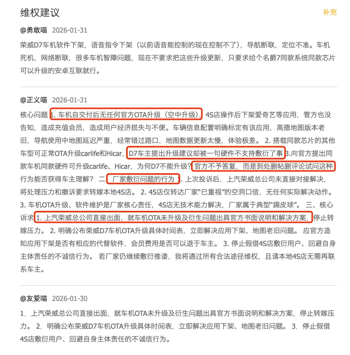 其二,同硬件标准下的差异化对待。车主明确举证,荣威D7搭载的联发科MT2712芯片,与同属上汽集团的名爵MG7车型为同款硬件,但MG7可持续获得OTA升级,包括Carlife、Hicar手机互联功能的迭代更新,而荣威D7车主提出的相同升级需求,被厂家以“硬件不支持”为由直接驳回。车主多次通过官方渠道反馈该问题,未获得正面详细解释,相关诉求帖文与评论还出现被删除的情况。
