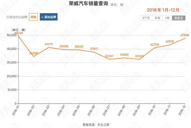 据车主之家统计,2017年荣威全年销量约38万台;2018年,这个数字飙升至历史巅峰的47万台,市占率达2.3%,荣威稳坐自主品牌第一阵营,成为上汽集团名副其实的销量支柱之一。