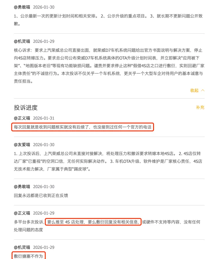 其三,厂家主体责任转嫁。车主表示,首次投诉提交后,上汽荣威总部未直接对接用户,而是将处理压力与撤诉要求转嫁给本地4S店经销商。但车机OTA升级、软件生态维护属于车企总部的核心责任,终端经销商无全面技术解决能力,仅向车主转达“厂家已重视”等空洞口信。