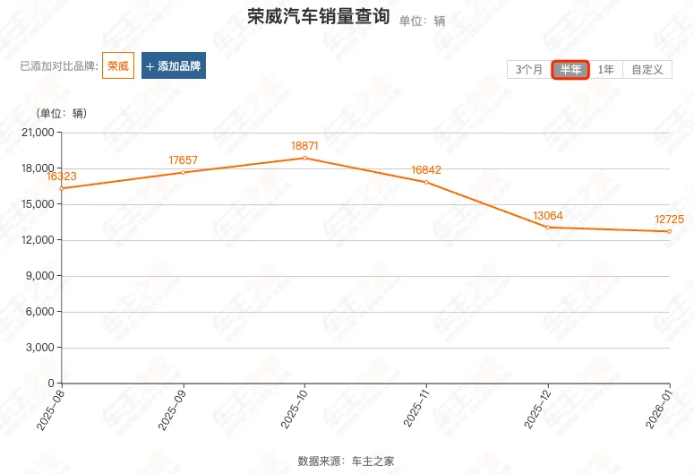 根据车主之家统计数据,荣威的销量在经历短暂的高位维持后开始掉头向下,2021年滑落至37万台,2022年更跌至28万台,到2024年,荣威全年销量已跌至14万台,较2018年的巅峰销量下滑70%。2025年略有回升至17万台,但与历史高点仍有巨大差距。最新数据显示,2026年1月单月销量已降至1.3万辆,市场份额不足1%。