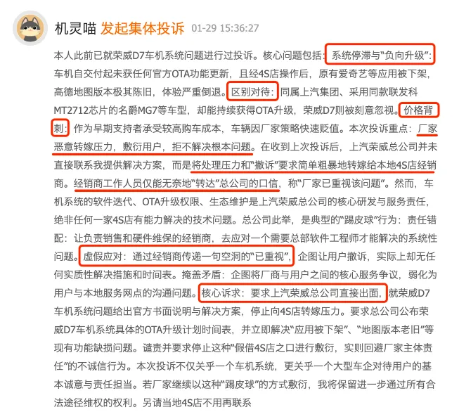 2026年2月,黑猫投诉平台上一则集体投诉,将上汽荣威推至舆论前台。15位荣威D7车主联合发起维权,直指车辆车机系统长期无OTA更新、功能遭“暗改”减配以及同硬件车型被区别对待。