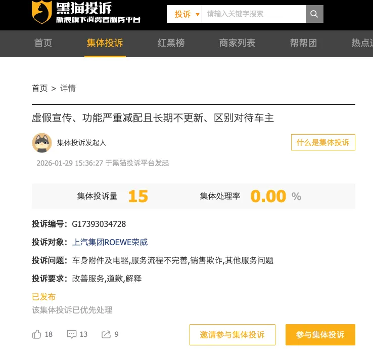本次集体投诉的核心事实,均来自车主公开提交的投诉材料。截至发稿,上汽荣威官方未就该投诉发布公开说明,也未针对车主核心诉求给出明确的书面解决方案,集体处理率为0%。