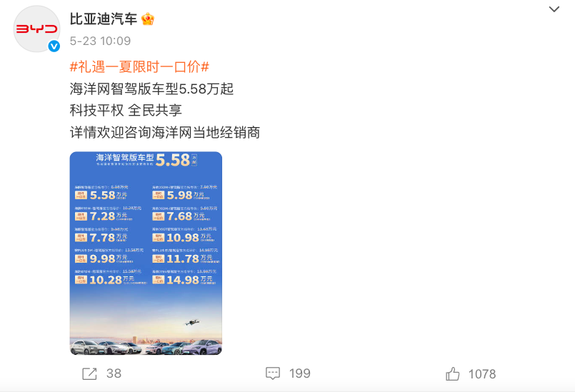 而车道漫谈查询5月23日当天的车企新闻,发现比亚迪赫然在列:5月23日,比亚迪官方推出限时“一口价”或限时补贴的促销活动,涉及王朝网、海洋网共计22款智驾版车型,最高补贴优惠可达5.3万元。
