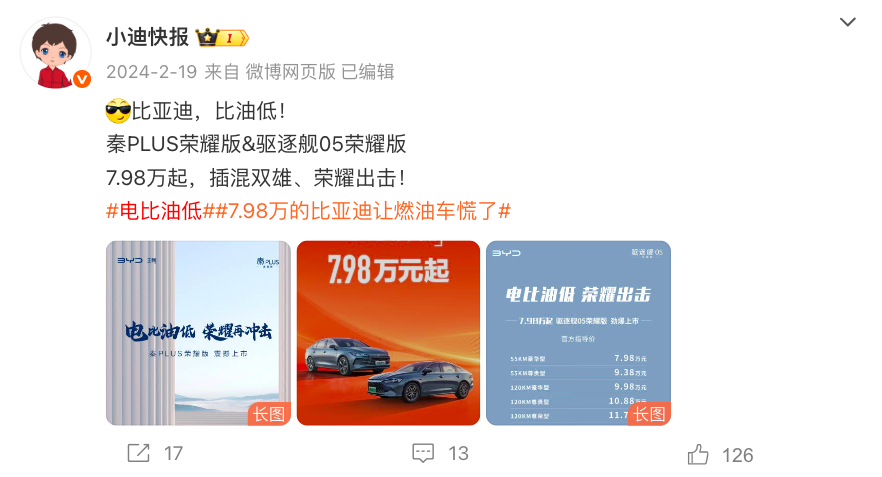 让我们先把时间调回到2024年2月19日,相信很多车企都忘不了这个铭心刻骨的时间节点。比亚迪以秦PLUS荣耀版7.98万元起售为号角,打出“电比油低”口号,首次将插混车型拉入7万元区间。这一刀精准刺向合资燃油车腹地——轩逸、朗逸等传统家轿的定价体系瞬间崩塌。五菱、长安、哪吒等十余家车企被迫应战,整个行业陷入“不降价即出局”的恐慌。