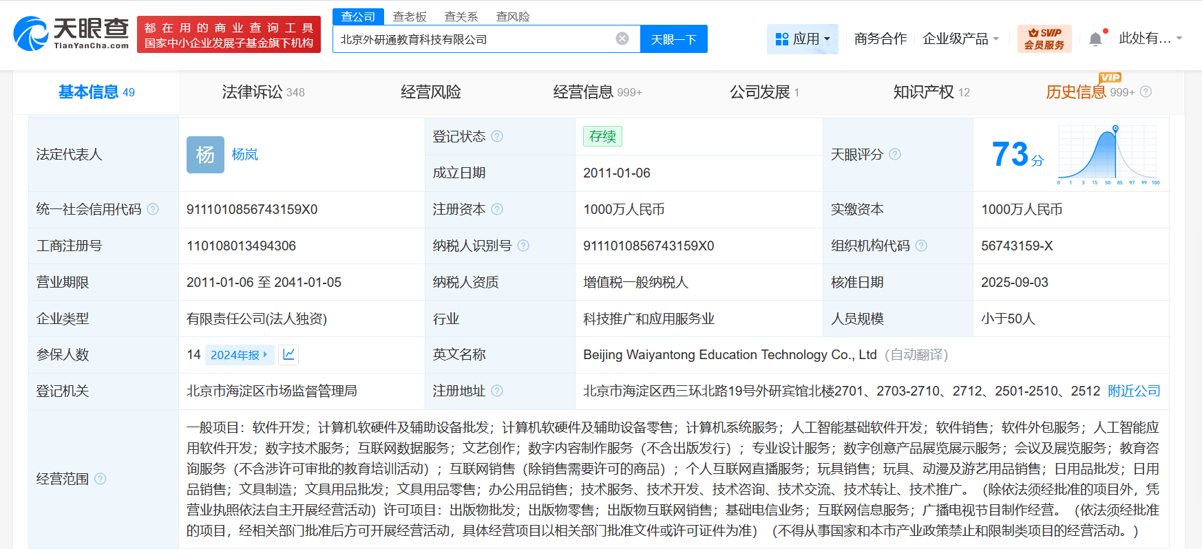 天眼查工商信息显示,北京外研通教育科技有限公司成立于2011年1月,法定代表人为杨岚,注册资本1000万人民币,经营范围含软件开发、计算机软硬件及辅助设备批发、计算机软硬件及辅助设备零售、计算机系统服务、人工智能基础软件开发、数字技术服务、互联网数据服务等。股东信息显示,该公司由外语教学与研究出版社有限责任公司全资持股。专利信息显示,该公司申请的多个点读笔专利因未缴年费专利权终止。