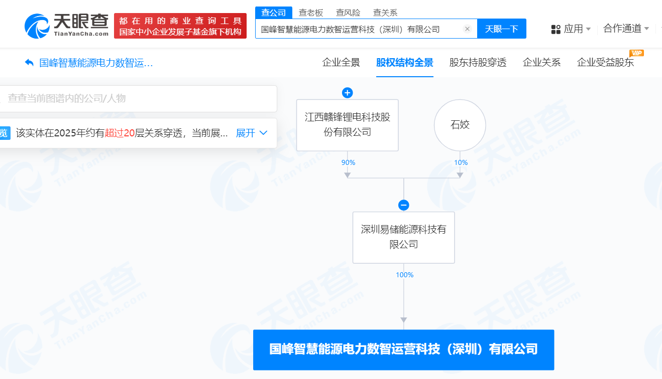 天眼查App显示,近日,国峰智慧能源电力数智运营科技(深圳)有限公司成立,法定代表人为刘锐,注册资本1亿人民币,经营范围含新兴能源技术研发、新能源原动设备制造、光伏设备及元器件制造、风力发电技术服务、储能技术服务、工业互联网数据服务、新能源汽车废旧动力蓄电池回收及梯次利用等。股东信息显示,该公司由赣锋锂业(002460)旗下深圳易储能源科技有限公司全资持股。