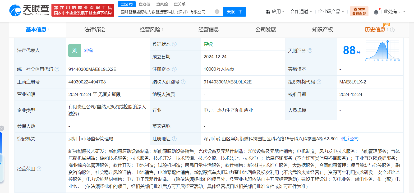 天眼查App显示,近日,国峰智慧能源电力数智运营科技(深圳)有限公司成立,法定代表人为刘锐,注册资本1亿人民币,经营范围含新兴能源技术研发、新能源原动设备制造、光伏设备及元器件制造、风力发电技术服务、储能技术服务、工业互联网数据服务、新能源汽车废旧动力蓄电池回收及梯次利用等。