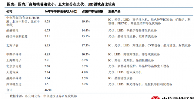 但在刻蚀机方面,国内企业已经取得了一定的成绩,市场份额已经达到15%。其中,北方华创(002371.SZ)的产品已经达到世界一流水平,刻蚀机和PVD设备已在全球主要企业得到广泛应用:14nm等离子硅刻蚀机已交付客户,28nmPVD机台已成为中芯国际的首选机台。