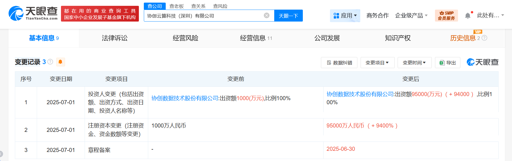 天眼查App显示,近日,协创云算科技(深圳)有限公司发生工商变更,注册资本由1000万人民币增至9.5亿人民币,增幅9400%。