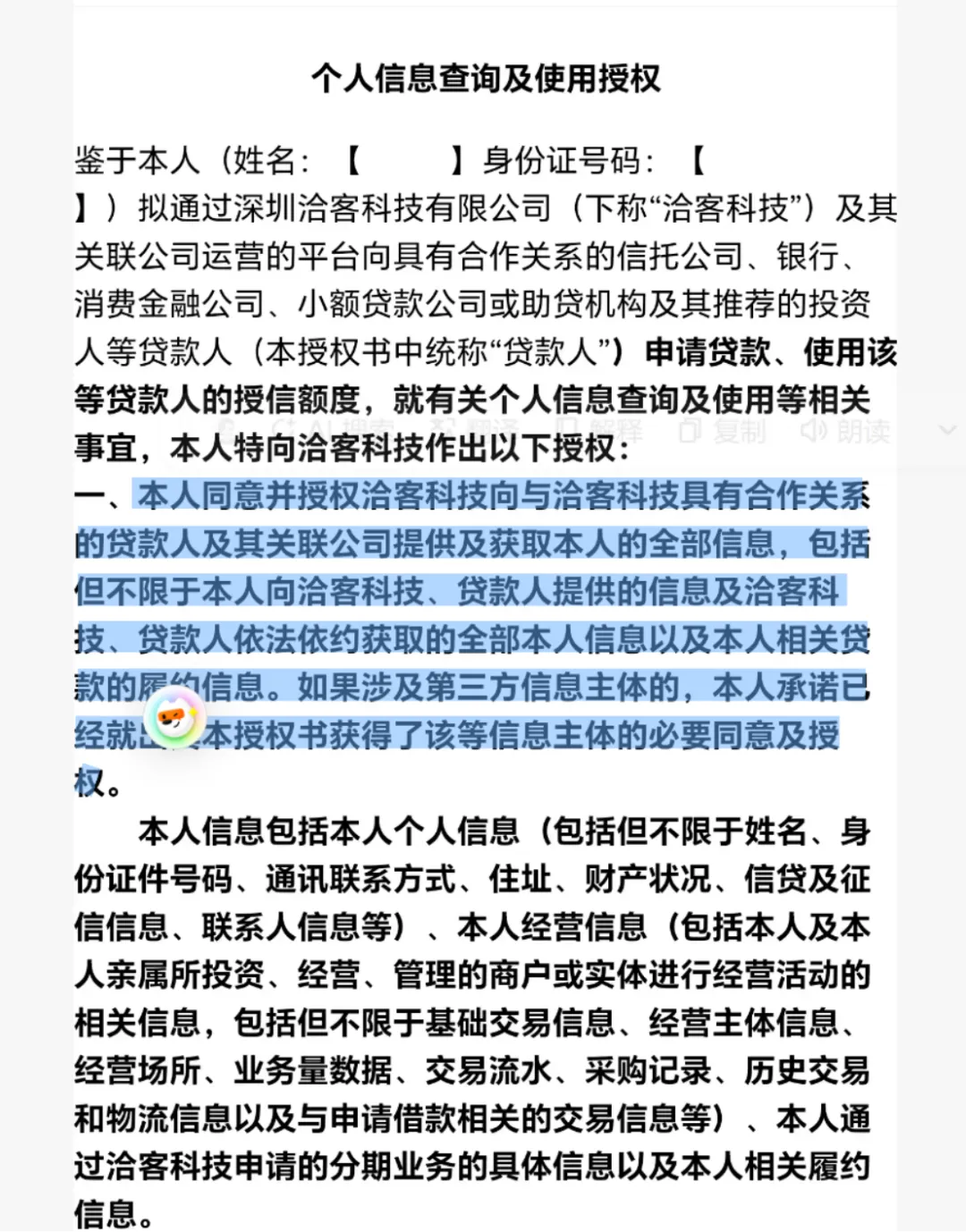 《协议》指出,本人同意并授权洽客科技向与治客科技具有合作关系的贷款人及其关联公司提供及获取本人的全部信息,包括但不限于本人向洽客科技、贷款人提供的信息及洽客科技、贷款人依法依约获取的全部本人信息以及本人相关贷款的履约信息。