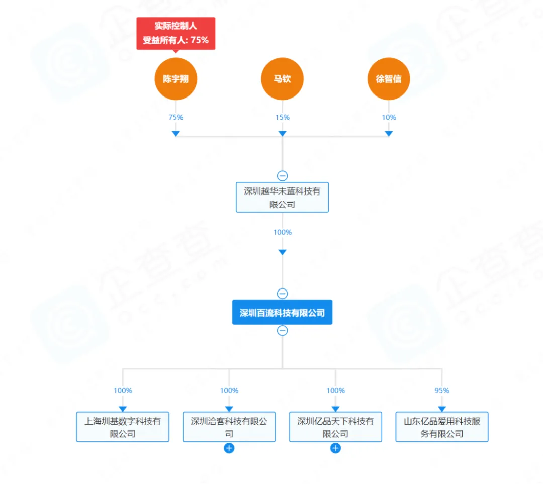 企查查显示,该公司成立于2017年2月14日,法定代表人为陈宇翔,其大股东为深圳百流科技有限公司。