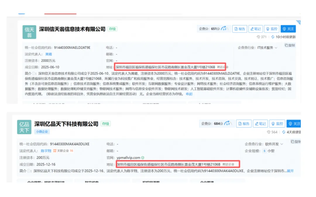 但其股东深圳信天翁信息技术有限公司的注册地址仍与亿品天下一致。