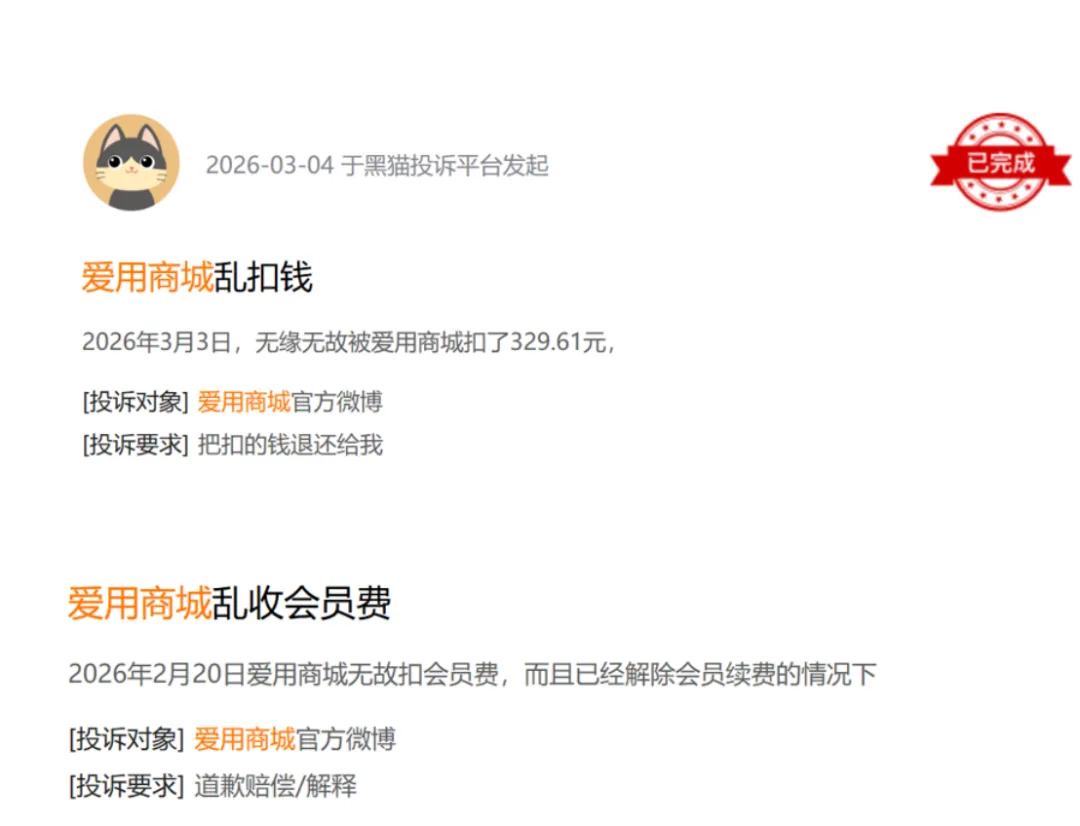 2026年3月4日,一用户称无缘无故被爱用商城扣走329.61元。
