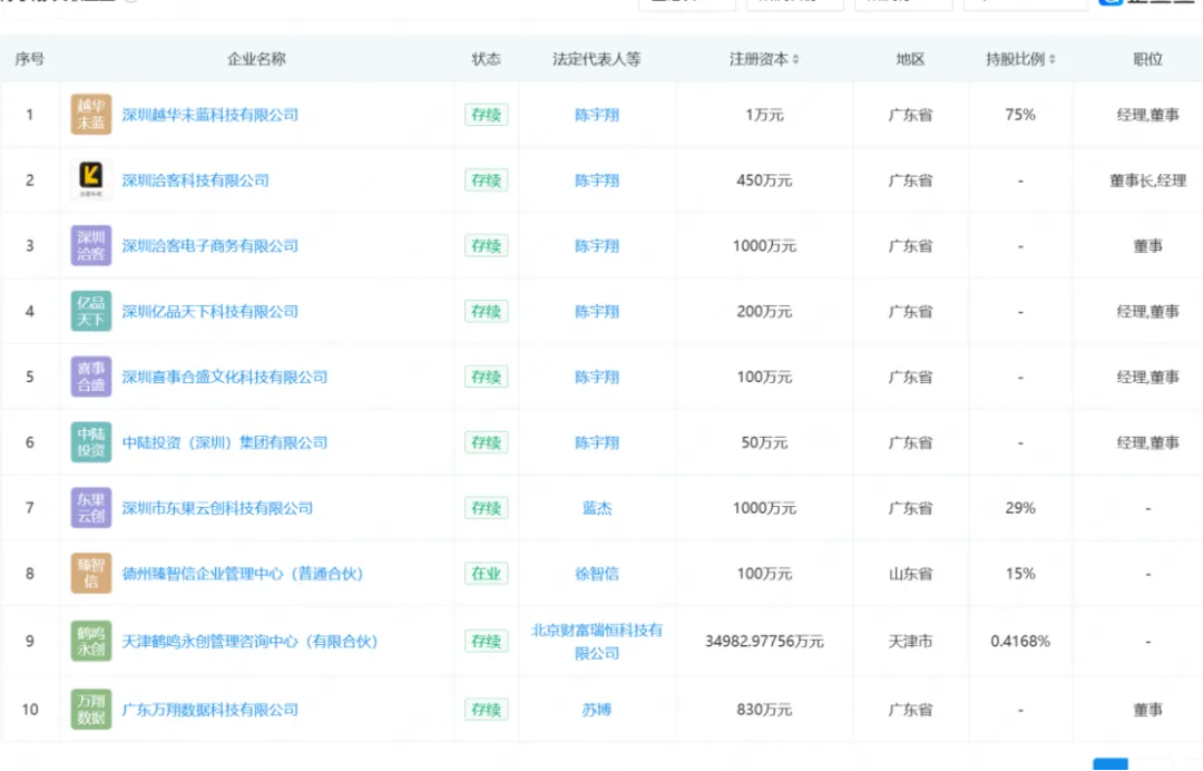与陈宇翔相关的公司共有16家,除洽客科技之外,还有深圳越华未蓝科技有限公司、中陆投资(深圳)集团有限公司等。