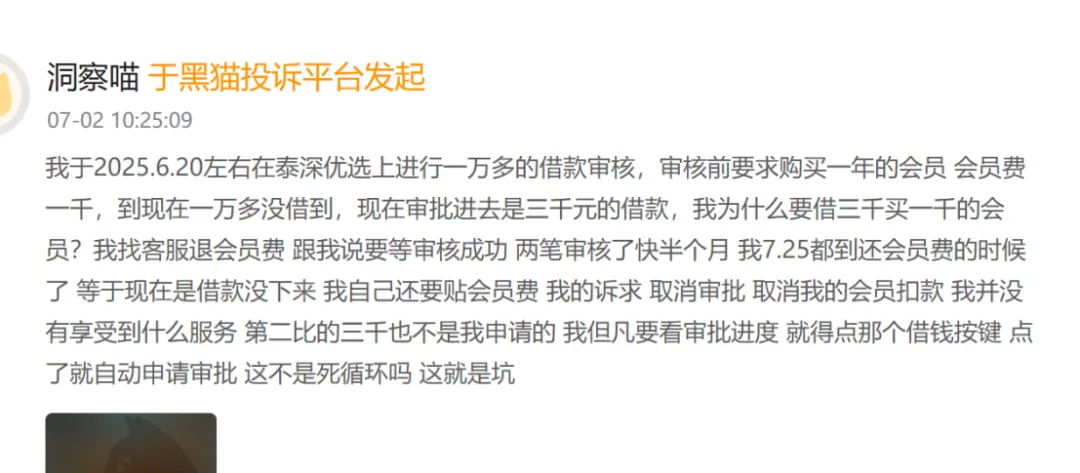 该用户表示,2025年6月20日,通过泰深优先上凯利盈达借款,结果一万多借款审核,需要支付1000元一年的会员费,最后一万元没借到,审批的额度还变成了3000。
