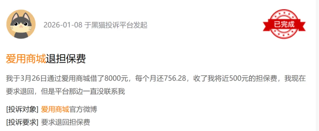 1月18日,另有用户投诉3月26日,在爱用商城借款8000元,每个月还款756.28元,收取担保费近500元。