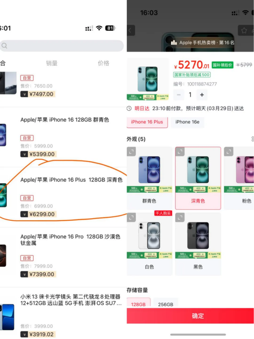 在凯利盈达商城中,128g的苹果16plus会员价为6299,但在京东上,国补后到手仅5270元。