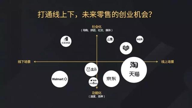 如果说,工业时代解决了产品规模化的问题,那么,互联网时代解决了用户规模化的问题,而新零售要解决的是产品与用户之间的精确匹配。由此便诞生了一些新零售商业机遇。我们用一张坐标图来表示目前新零售业态中的几种特性,其中纵向表示社会化到功能化,横向表示线下场景以及线上场景的倾向性。
