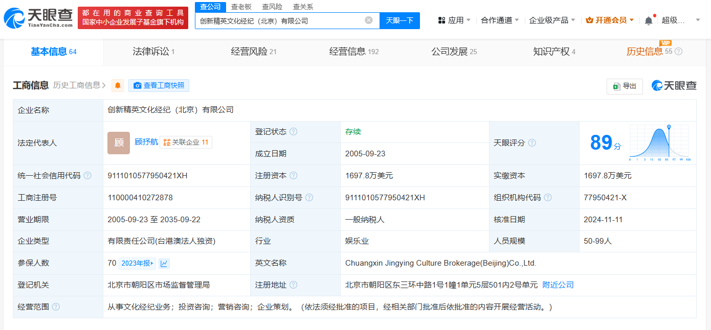 天眼查App显示,创新精英文化经纪(北京)有限公司成立于2005年9月,法定代表人为顾抒航,注册资本1697.8万美元,经营范围包括从事文化经纪业务、投资咨询、营销咨询、企业策划,由CAA China HK Holdco Limited全资持股。对外投资信息显示,该公司持有上海一物影视文化合伙企业(有限合伙)50%股份,同时还有1家存续的静安分公司。知识产权信息显示,该公司已注册多枚“ICNADAE”商标。