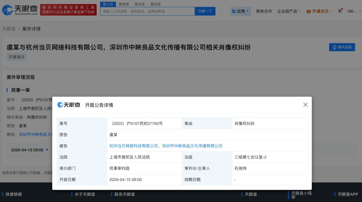 天眼查天眼风险信息显示,近日,虞书欣分别与荆州市一统网络科技有限公司、杭州当贝网络科技有限公司等新增开庭公告,原告均为虞书欣,案由均为肖像权纠纷,两案均于2026年4月15日在上海市普陀区人民法院开庭审理。