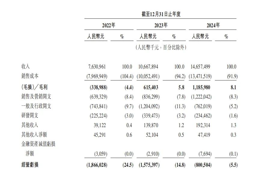 从2022年至2024年,曹操出行的营收分别为76.31亿元、106.68亿元、146.57亿元,毛利分别为-3.39亿元、6.15亿元、11.86亿元,毛利率分别为-4.4%、5.8%、8.1%,经调整净亏为16.51亿元、9.66亿元、7.24亿元。