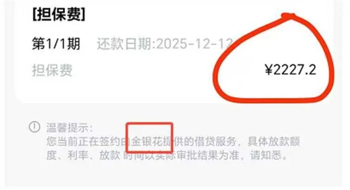借款页面显示,这笔2227.2元扣费的名目为“担保费”,并提示“您当前正在签约由金银花提供的借贷服务,具体放款额度、利率、放款时间以实际审批结果为准。”小范认为相关费用收取十分不合理,要求退款。
