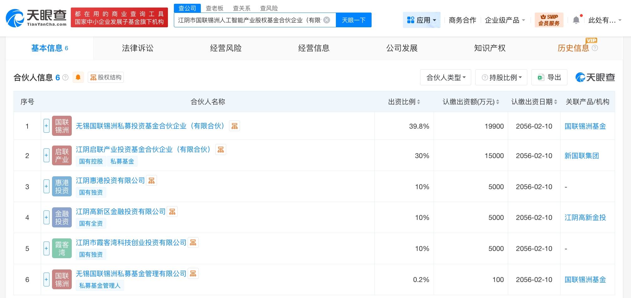 天眼查工商信息显示,近日,江阴市国联锡洲人工智能产业股权基金合伙企业(有限合伙)成立,执行事务合伙人为无锡国联锡洲私募基金管理有限公司,出资额5亿人民币,经营范围为以私募基金从事股权投资、投资管理、资产管理等活动;以自有资金从事投资活动。合伙人信息显示,该基金由无锡国联锡洲私募投资基金合伙企业(有限合伙)、江阴启联产业投资基金合伙企业(有限合伙)、江阴惠港投资有限公司等共同出资。