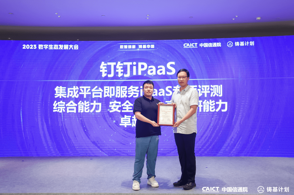 近日,在2023数字生态发展大会上,中国信通院“铸基计划”公布了iPaaS(集成平台即服务)测评结果,钉钉连接平台(iPaaS)在自研能力、安全能力和综合能力三项测评中都达到最高级别“卓越级”,成为首批首个获得全卓越级评级的iPaaS平台。