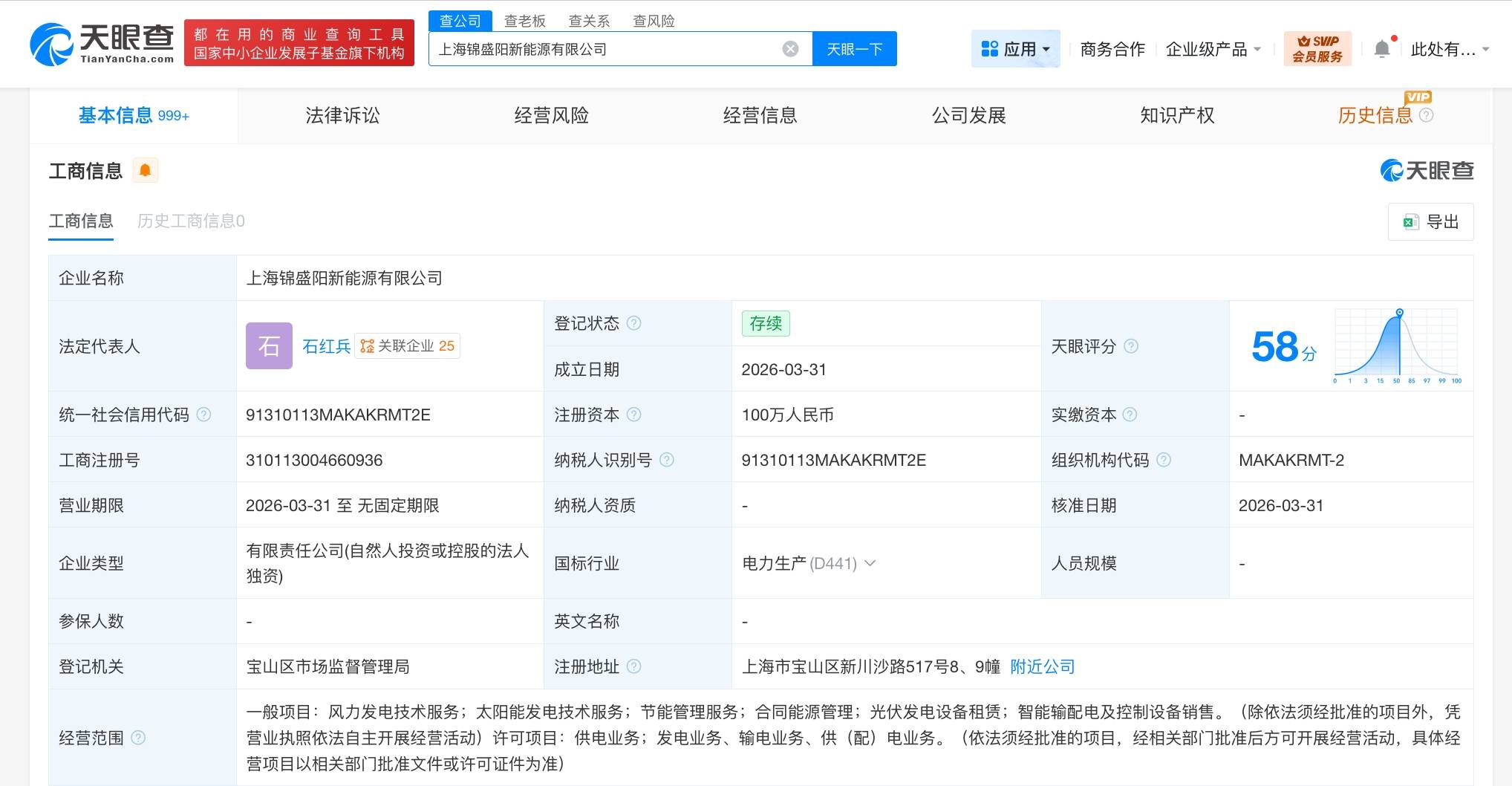 天眼查工商信息显示,近日,上海锦盛阳新能源有限公司成立,法定代表人为石红兵,注册资本100万人民币,经营范围包括风力发电技术服务、太阳能发电技术服务、节能管理服务、合同能源管理、光伏发电设备租赁等。