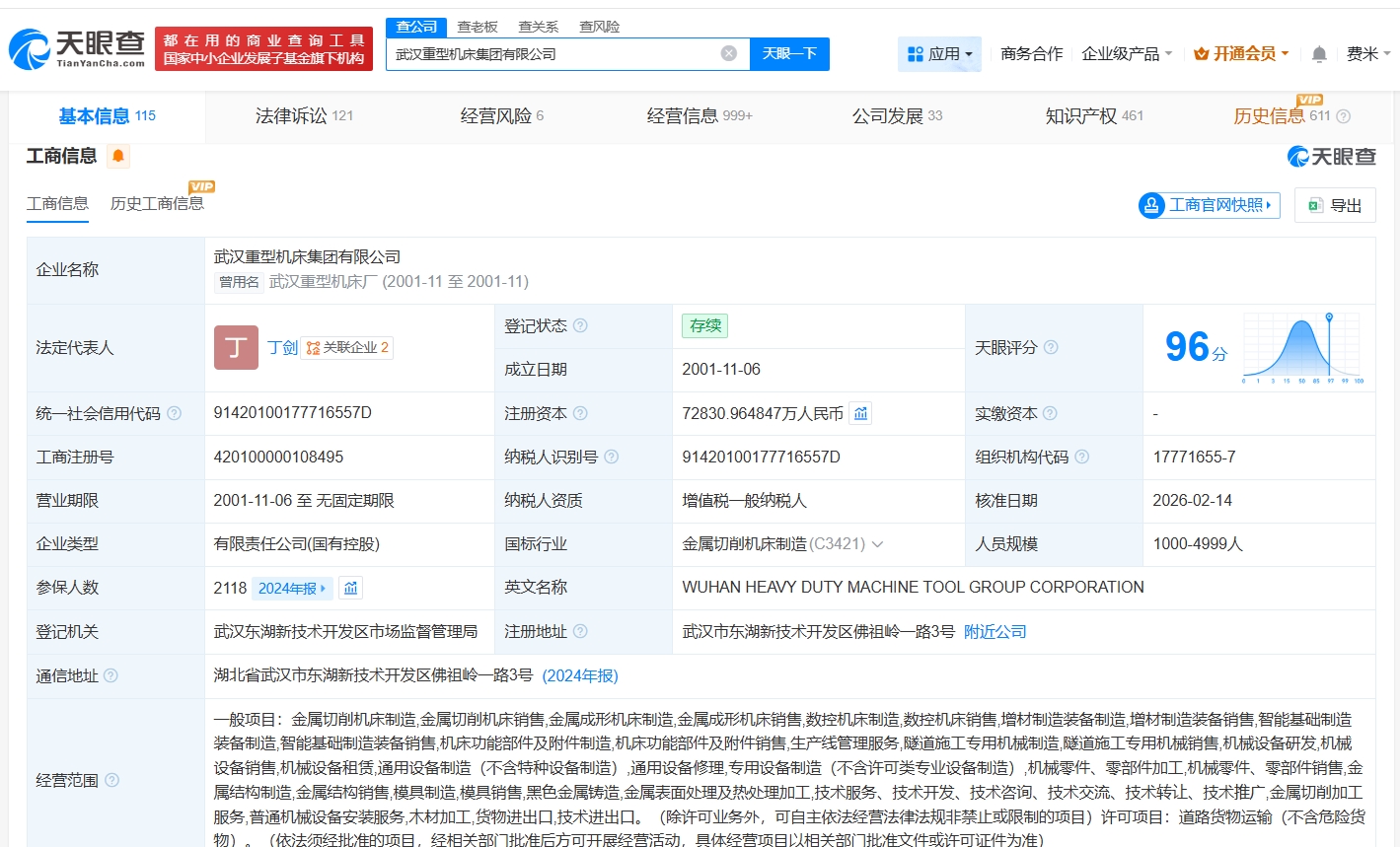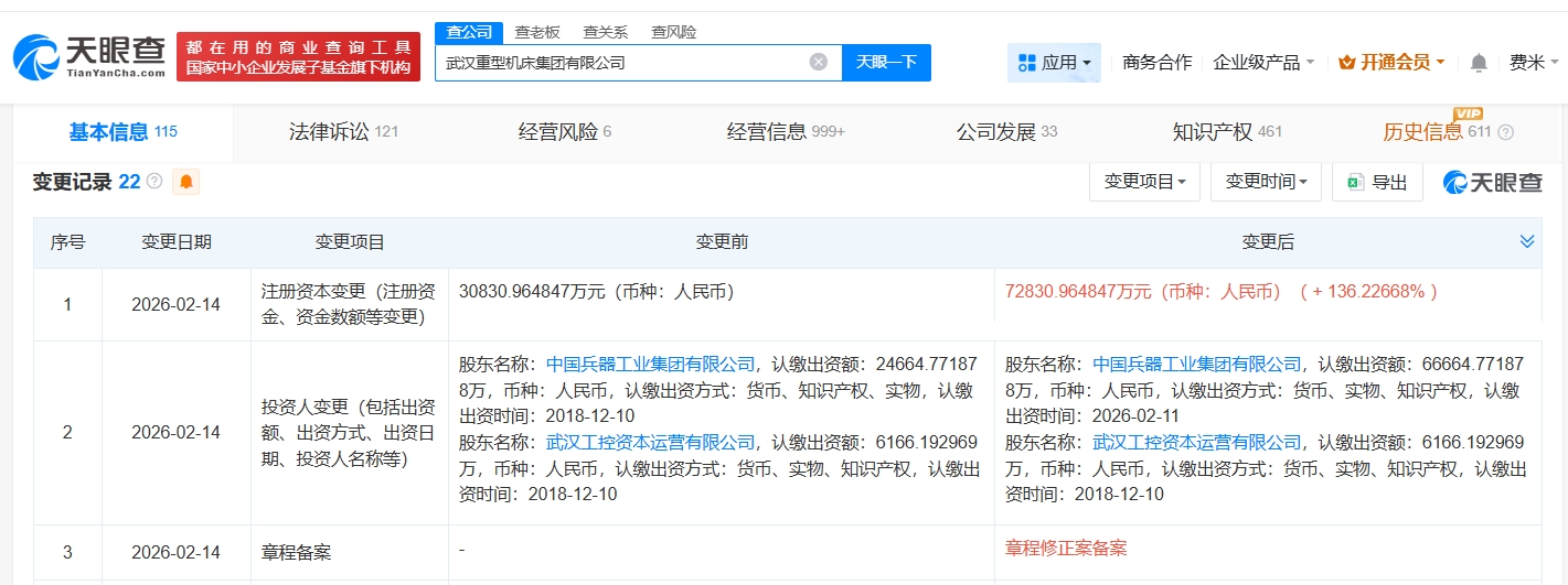 天眼查App显示,近日,武汉重型机床集团有限公司发生工商变更,注册资本由约3.1亿人民币增至约7.3亿人民币,增幅约136%。