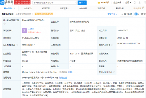 企查查信息显示,该公司成立于2021年5月,法定代表人为王俊仁,经营范围包含:动漫游戏开发;软件开发;平面设计;数字文化创意软件开发;体育中介代理服务等。