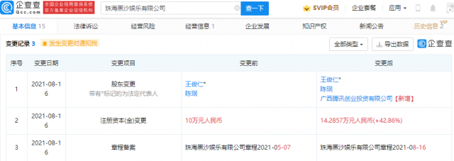 【TechWeb】企查查APP显示,8月16日,珠海黑沙娱乐有限公司发生工商变更,新增股东广西腾讯创业投资有限公司,同时公司注册资本由10万元人民币增加至14.29万元人民币,增幅为42.86%。
