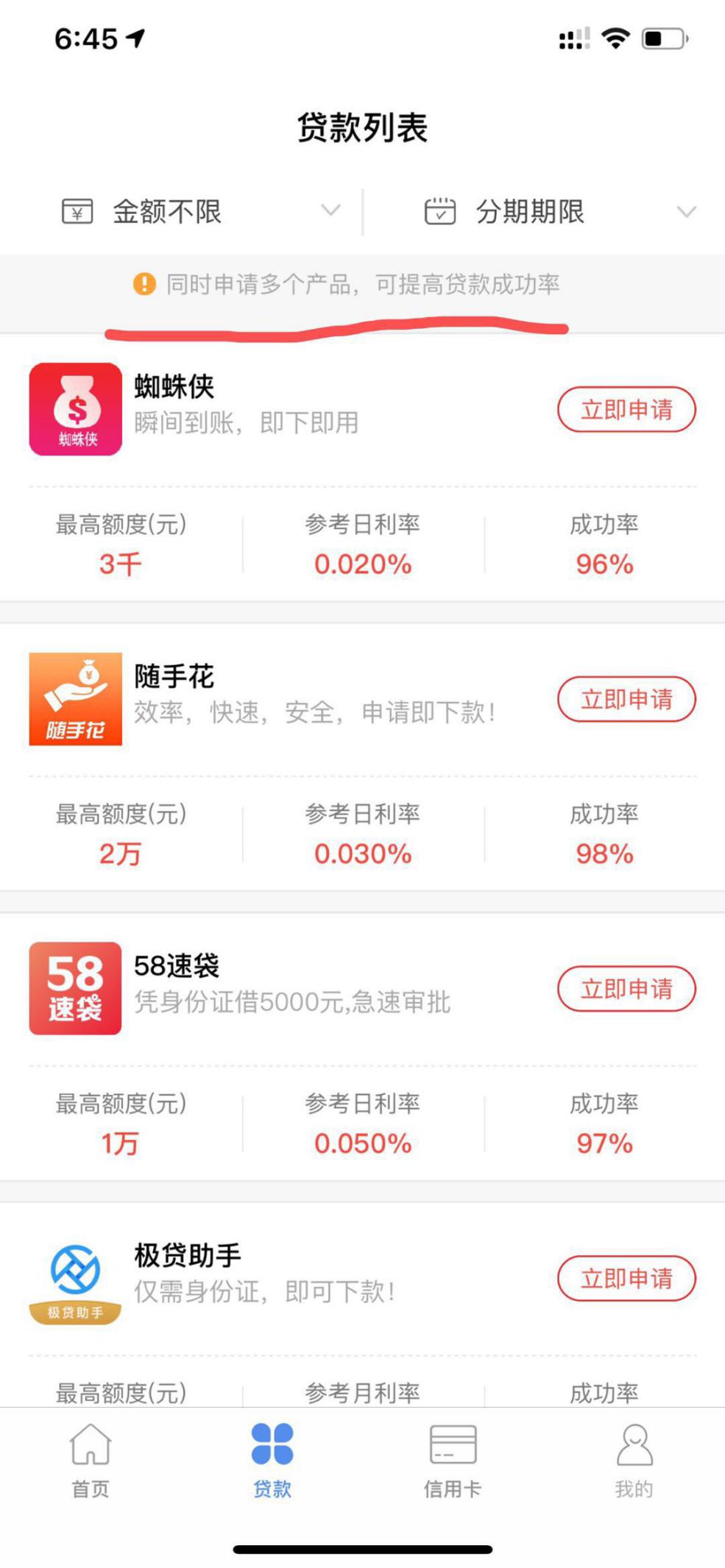 同时,在贷款页面顶部,大王贷款发布提示称,“同时申请多个产品,可提高贷款成功率”。