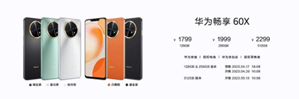 在价格方面,华为畅享60X8+128GB 售价1799元;8+256GB 售价1999元;8+512GB 售价 2299 元,4月26日10点08分正式开售,512GB版本5月13日10点08分开售。首销前全款预定优惠50元,各个线上平台均有不同购机优惠,赶紧锁定这波首销优惠,冲就对了!
