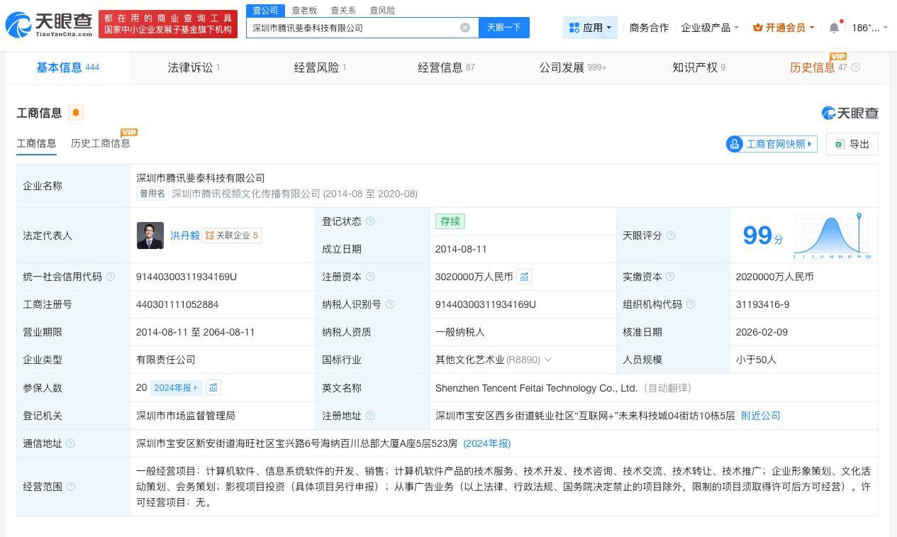 天眼查App显示,出品方腾讯视频关联公司深圳市腾讯斐泰科技有限公司成立于2014年8月,法定代表人为洪丹毅,注册资本302亿人民币,经营范围包括影视项目投资,从事广告业务等。股东信息显示,该公司由马化腾、许晨晔、卢山共同持股。