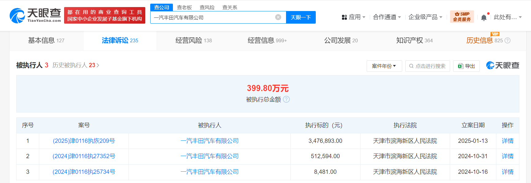 天眼查法律诉讼信息显示,近日,一汽丰田汽车有限公司新增一条恢复执行信息,执行标的347万余元,执行法院为天津市滨海新区人民法院。