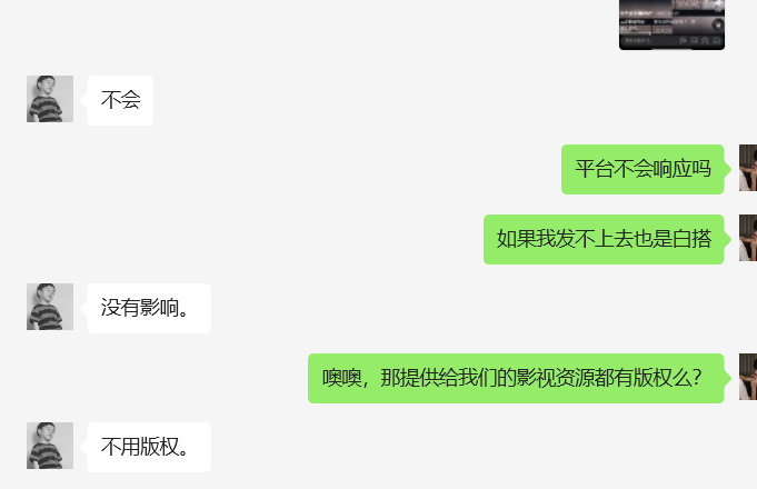 实际上,当询问收徒教学博主提供的影视素材是否有版权时,大部分博主都直言“没有版权”“不需要版权”,但可以通过剪辑、配音解说等方式来规避审核风险。