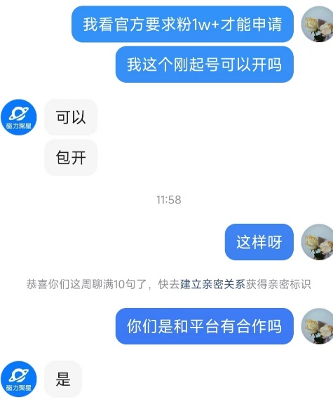 据悉,快手平台的光合计划、磁力聚星是博主们重要的变现收入来源。以磁力聚星为例,开通条件为粉丝大于1万,开通后,就可接取平台任务,一天的收益在几百至上千元不等。然而,平台上还有一些账号如“磁力聚星班长”“磁力聚星开通”等,称其与平台有合作,可以零粉付费开通变现服务。
