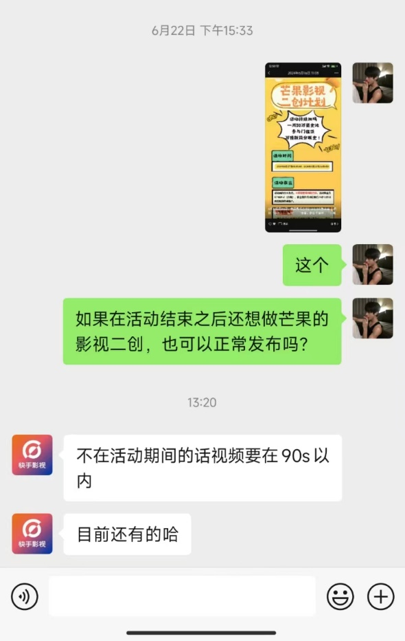 对于活动结束后是否还能继续二创的问题,快手影视小助手则表示,不在活动期间的话制作的视频要在90秒以内。至于为何要在90秒以内,快手影视小助手表示,一般影视二创的时间都是在90秒以内,快手磁力聚星的任务也是这样,版权要求。