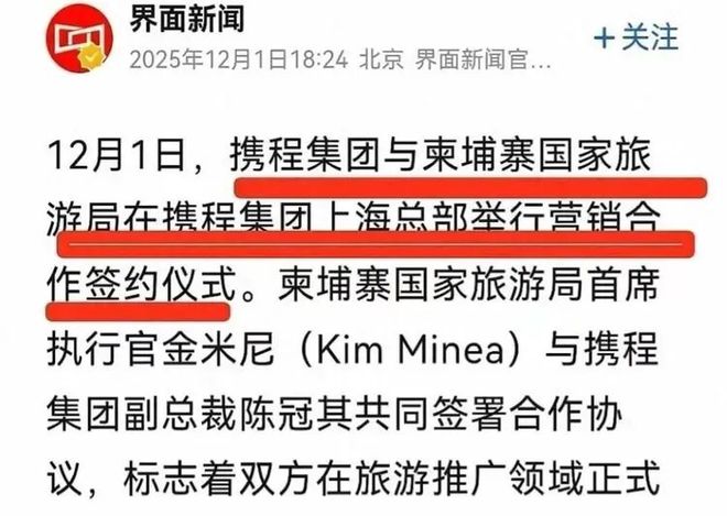 12月1日,携程和柬埔寨国家旅游局在上海签下合作协议,本意是推动旅游复苏,结果却在社交平台引爆了一场“信任危机”。